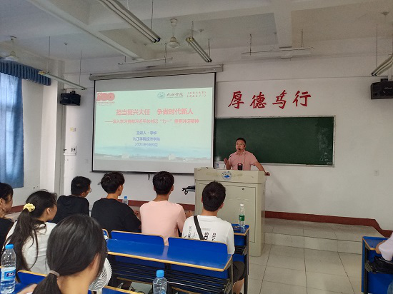 授课过程中,领导们以“担当复兴大任,争做时代新人”为主题,分别从“总书记“七一”重要讲话要览、牢记总书记殷切嘱托,强国有你等方面给同学们进行讲授和交流,并结合太阳成集团tyc9728人才培养能力和素质要求,鼓励同学们在新的时代背景下,要尽快确立新目标、开启新征程,把个人前途和命运同时代发展、国家前途和社会进步紧密联系在一起,争做一个对社会有用的人。