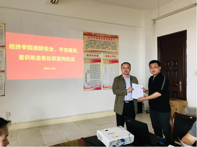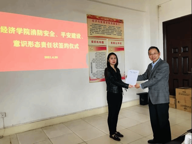 为加强学院意识形态工作建设、平安建设及消防安全管理工作,明确主体责任,保障学院安全稳定发展,4月20日下午,经济学院在义丰楼会议室举行太阳成集团tyc97282021年意识形态、消防安全、平安建设工作责任状签订仪式。会议由学院党委书记漆晗东主持。学院党委书记漆晗东、院长项益才与各科室、教研室负责人、支部书记层层签订了2021年度意识形态、消防安全、平安建设工作责任状。