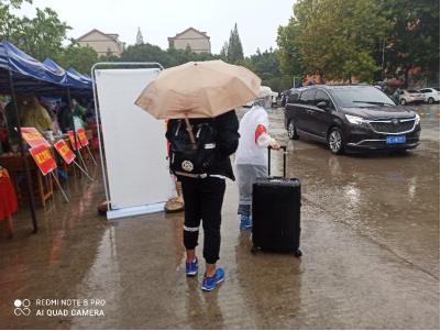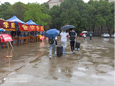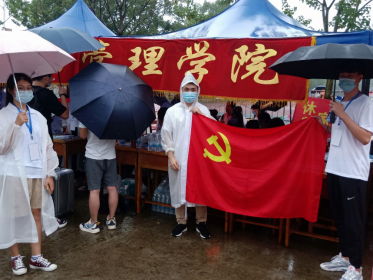 在九江火车站,学长学姐热情接待新生,并安排他们坐上九江学院接他们的校车。在九江学院内,迎新时,下着小雨,党支部的学长学姐热心接待从外地赶来读书的学生和家长,面对他们的疑惑,耐心解答。