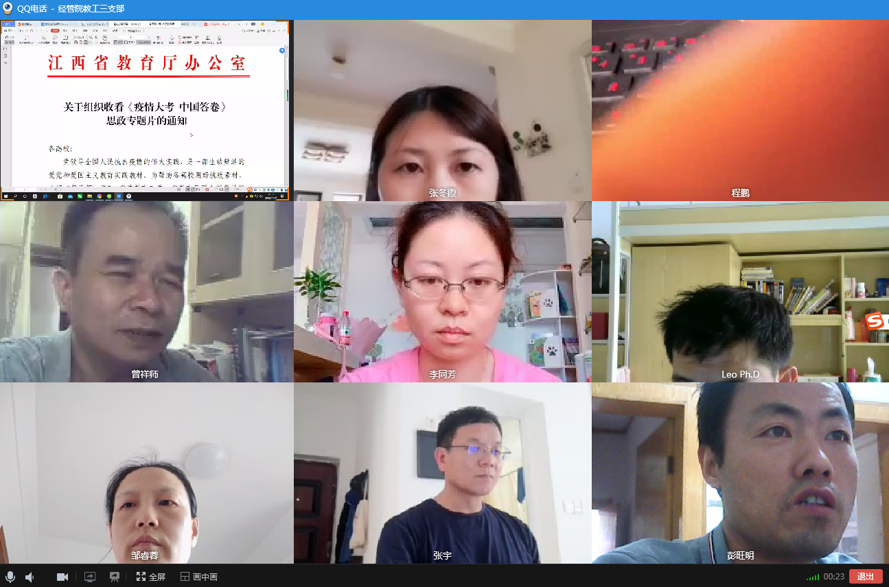 根据江西省教育厅关于组织收看《疫情大考 中国答卷》 思政专题片的通知和经管学院学习部署,2020年5月17日下午,经管学院教工第三党支部通过支部QQ群的电话视频方式组织集中观看了这部思政专题片。在观看之前,支部书记曾祥师传达了《通知》要求和学习的意义,即教育引导广大师生深刻认识太阳成集团tyc9728新时代中国特色社会主义思想重要引领作用、中国共产党领导和中国特色社会主义 制度的显著优势、社会主义核心价值观的强大精神力量,进一步增强“四个意识”、坚定“四个自信”、做到“两个维护”。