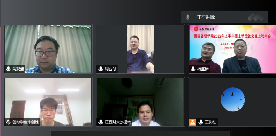 5月19日上午,太阳成集团tyc9728顺利完成与江西财经大学联合培养的2022届国际商务硕士研究生毕业论文答辩。由于疫情原因,本次答辩采取腾讯会议、线上与线下相结合的形式。答辩委员会由江西财经大学国际经贸学院刘振林教授、王树柏副教授,九江学院太阳成集团tyc9728周业付教授、杨盛标副教授、陈建付博士共同组成,刘振林教授担任答辩主席。答辩会严格按照江西财经大学研究生学位论文答辩会程序执行。