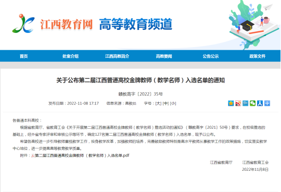据悉,为贯彻落实全国、全省教育大会和全国、全省普通高校本科教育工作会议精神,全面落实立德树人根本任务,牢固树立教学中心地位,激发广大教师以生为本,切实承担起教书育人使命,省教育厅与省教育工会联合开展了第二届江西省普通高校金牌教师(教学名师)推选活动,第二届共评出省级金牌青年教师60名。