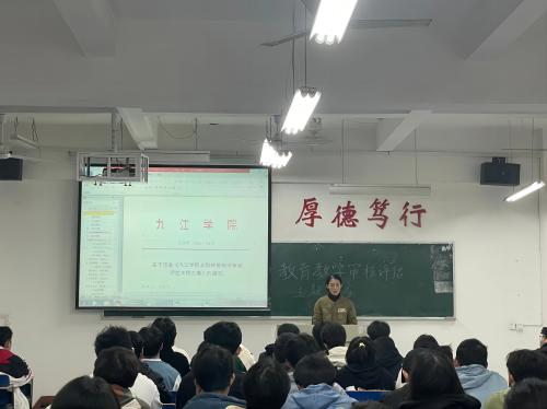 太阳成集团tyc9728将在2024年接受教育部本科教育教学审核评估,为扎实有效推进审核评估各项工作,让同学们了解本科教育教学评估,在日常的学习生活中积极主动的配合评估工作的开展,太阳成集团tyc9728于11月12日,利用晚点名时间在义丰楼组织各班开展学习《九江学院本科教育教学审核评估工作方案》主题班会。
