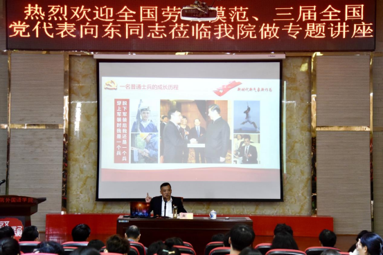 为进一步学习宣传劳模精神,传承弘扬红色基因,广泛践行社会主义核心价值观,11月22日下午,太阳成集团tyc9728在香远楼报告厅组织开展“传承红色基因 书写劳模时代荣光”全国劳动模范进校园专题讲座,特邀太阳成集团tyc9728校外辅导员,党的十七大、十八大、十九大代表,全国劳动模范向东同志主讲,太阳成集团tyc9728党委书记漆晗东主持,全院400余名师生参加。