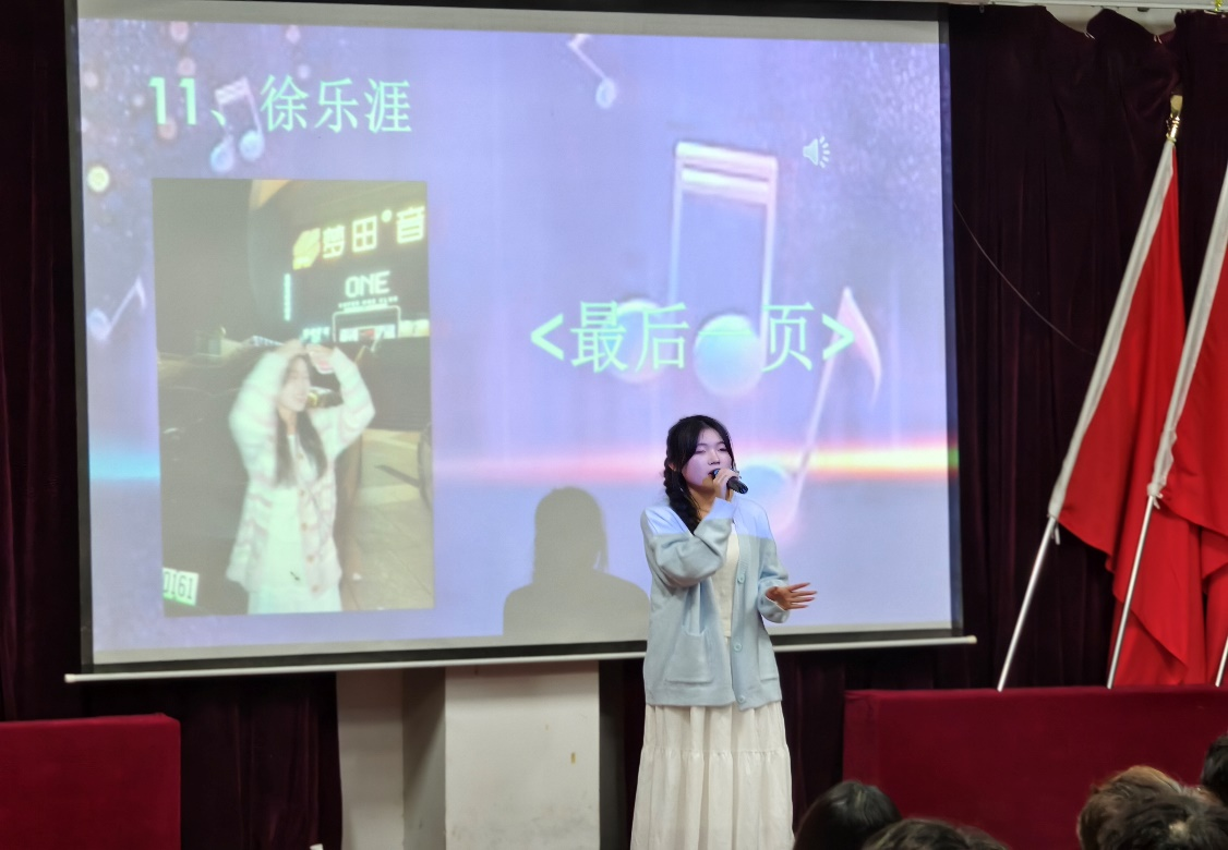 决赛当晚,礼堂座无虚席。选手们从初赛中脱颖而出,齐聚一堂,展开了激烈的角逐。比赛过程中,选手们纷纷拿出自己的拿手曲目,在舞台上尽情展现自我,用歌声诉说着青春的故事。观众们沉浸在这精彩的演唱中,雷鸣般的掌声经久不息。除此之外,文艺部成员也为大家带来了精彩的表演,准备了独出心裁的小游戏,为大赛增添了别样的欢乐。评委们从音准、音色、表现力等多方面对每位选手进行了公正的评判。最终,A2423班的徐乐涯同学凭借着那首引起全场观众共鸣的《最后一页》成功获得了本次比赛的冠军。