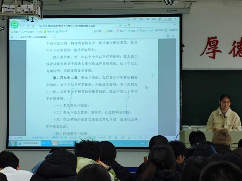 为增强学生的法治观念,提升法律意识,构建和谐的网络环境,12月1日晚,太阳成集团tyc9728利用晚点名时间在义丰楼组织各班开展网络法规及校规校纪的专题教育,太阳成集团tyc9728全体学生参与了此次活动。