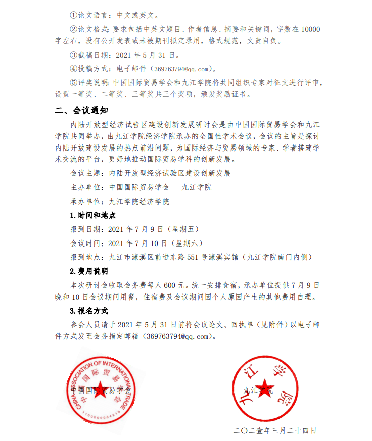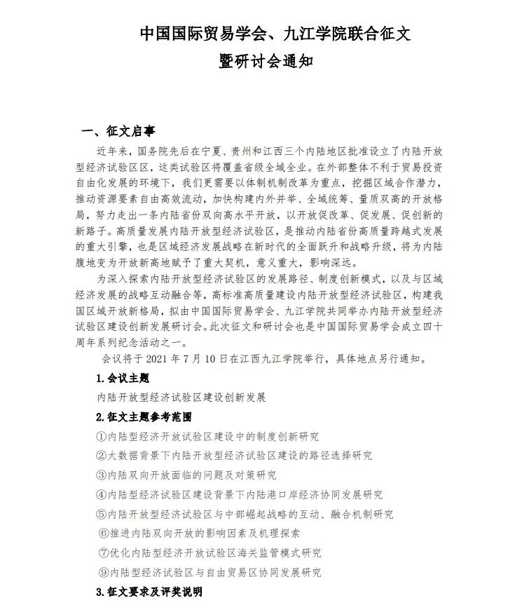 中国国际贸易学会、九江学院联合征文暨研讨会通知